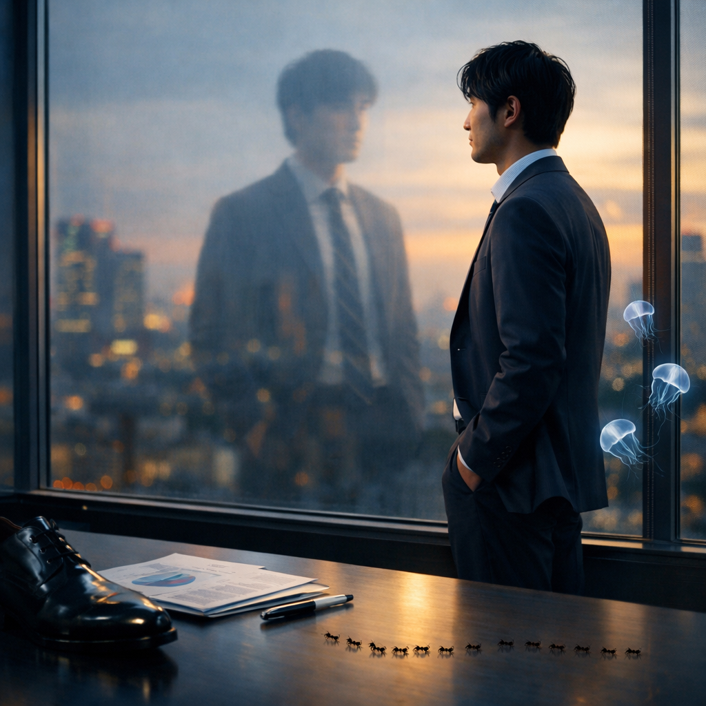 かつての彼は、正しい答えを一つ見つけようとしていた。今の彼は、異なるものの間に橋を架けようとしている。靴の光沢も、蟻の列も、クラゲの揺らぎも、それぞれ単独では役に立たない比喩に見える。だが、離れた話題をつないだとき、人は自分の仕事を別の角度から見直せる。